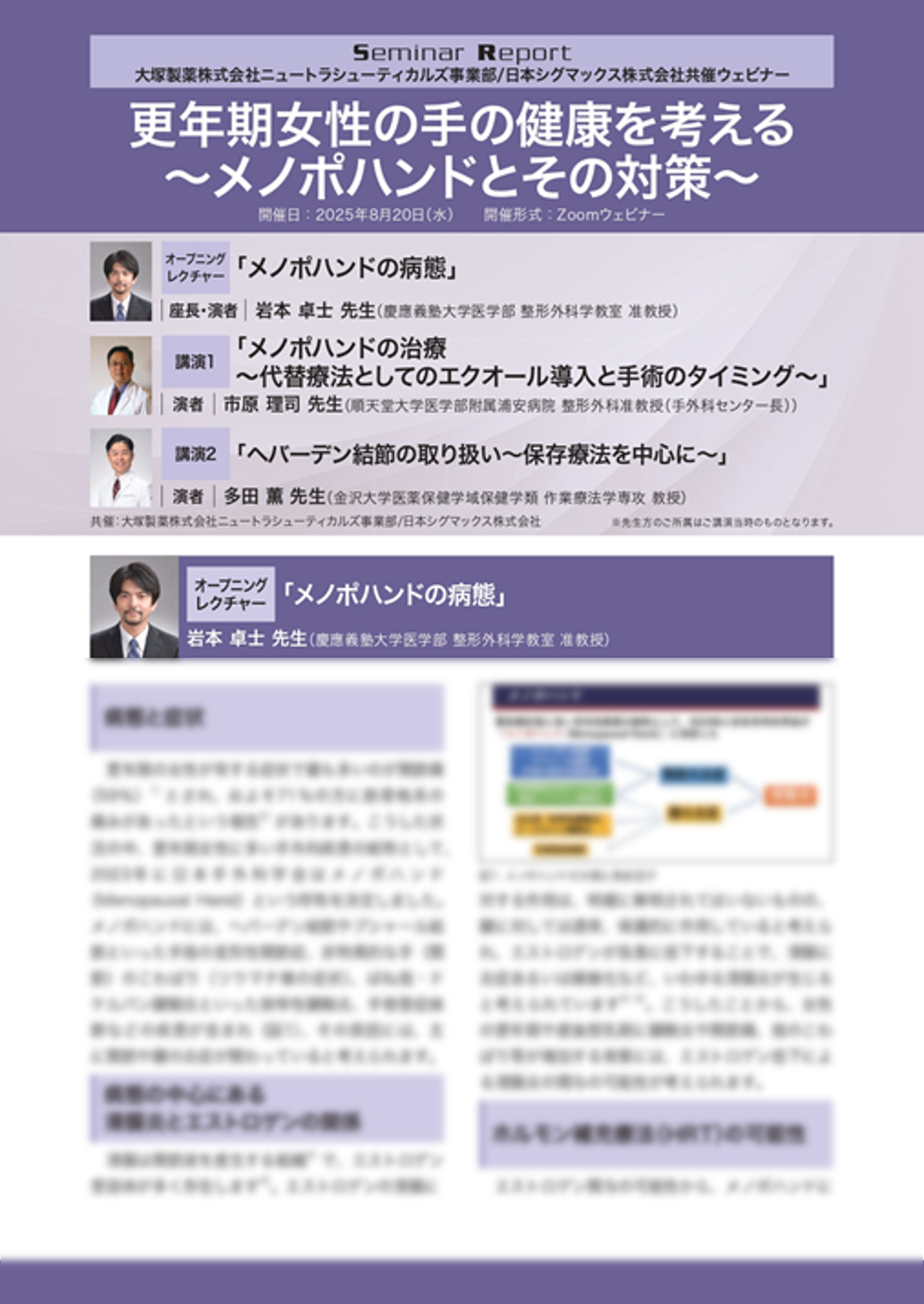 本セミナーレポートでは、手外科のスペシャリストの先生方より、更年期世代の女性に多く見られる手の不調として注目されている「メノポハンド(※)」に関する病態から治療・セルフケアについてご講演いただきました。